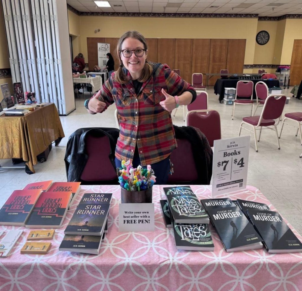 Well, to be honest, I was super nervous and really freaked out all day. We set up at 9 a.m. at the library, the event started at 11 a.m., and we left around 3:30 p.m. But I channeled my mom’s outgoing energy and used my best people skills. M said I did awesome. I even sold 20 books and gave away some bookmarks and business cards! And my free funky pen giveaway was a big hit! People really liked them. When someone would walk by my table, I’d ask if they wanted a free pen and then I’d ask if they wanted a book! ^_^